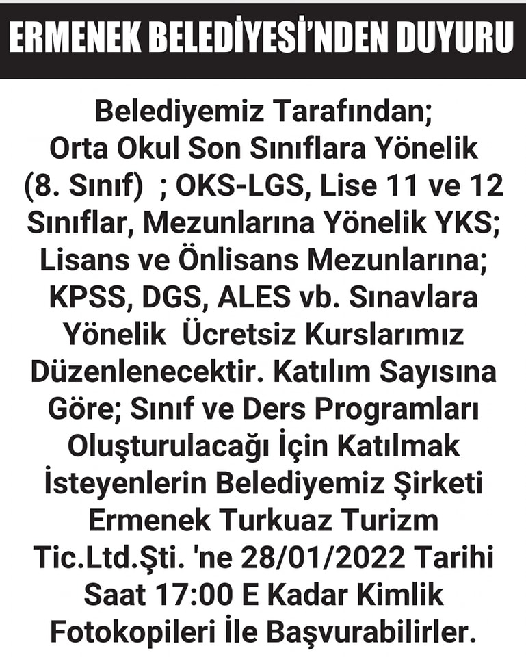 Ermenek Belediyesinden Öğrencilere Ücretsiz Kurs 26 Ocak 2022, 09:21