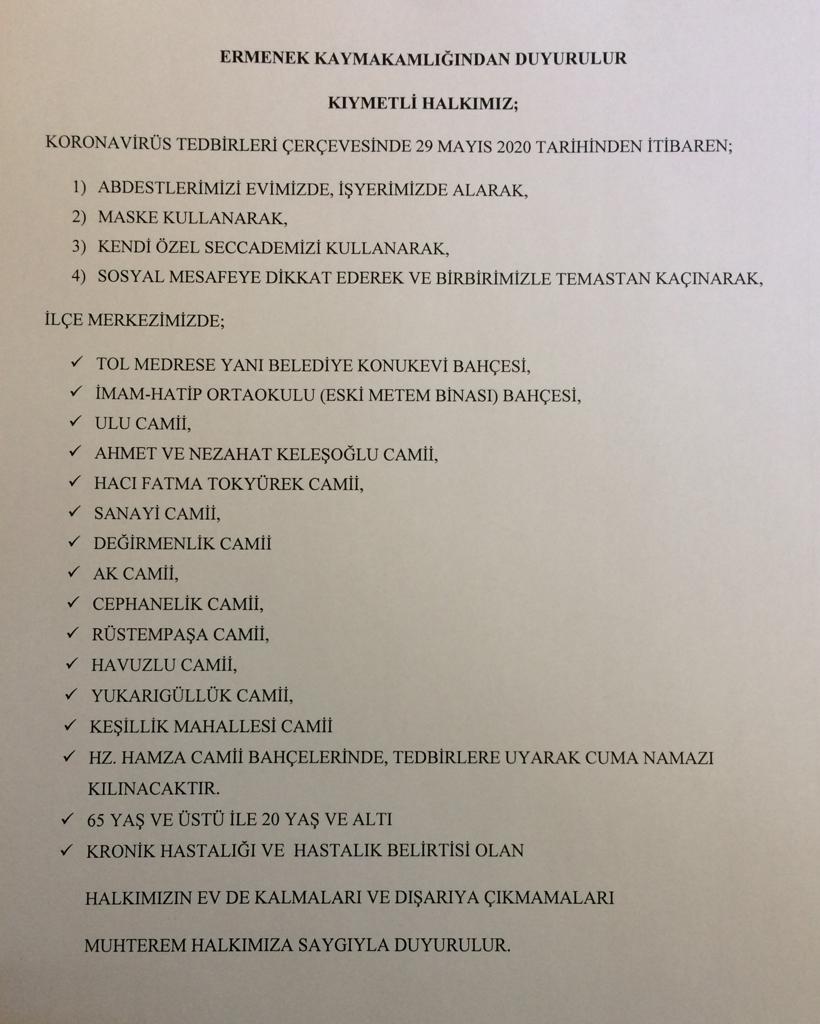 Corona virüsü salgını tedbirleri kapsamında 16 Mart’ta ibadete kapatılan camiler yarın Cuma namazıyla ibadete açılıyor. Geçtiğimiz günlerde Cuma namazlarının kılınması için İçişleri Bakanlığı tarafından yayınlanan genelge, hıfzıssıhha kurulu kararları ve İlçe Kaymakamlığı ile İlçe Müftülüğü tarafından alınan karar doğrultusunda Cuma namazının Lütfi Elvan Kent Meydanında kılınması uygun olduğu bildirilmiş fakat yapılan değerlendirmeler neticesinde aynı gün kurulan halk pazarı ve sosyal mesafe kurallarına uygun olmadığı belirtilerek uygun görülmemiştir. Aşağıdaki belirtilen şartlar doğrultusunda ekli listeye göre Cuma namazının kılınacağı yerler belirtilmiştir. Tüm halkımıza duyurulur.