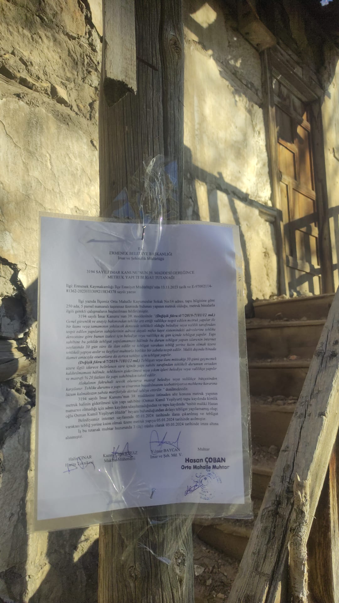 Belediyemiz internet sayfasında 05.01.2024 tarihinde ilana çıkarılmış ve tebligat varakası tebliğ yerine kaim olmak üzere metruk yapıya 05.01.2024 tarihinde asılmıştır.